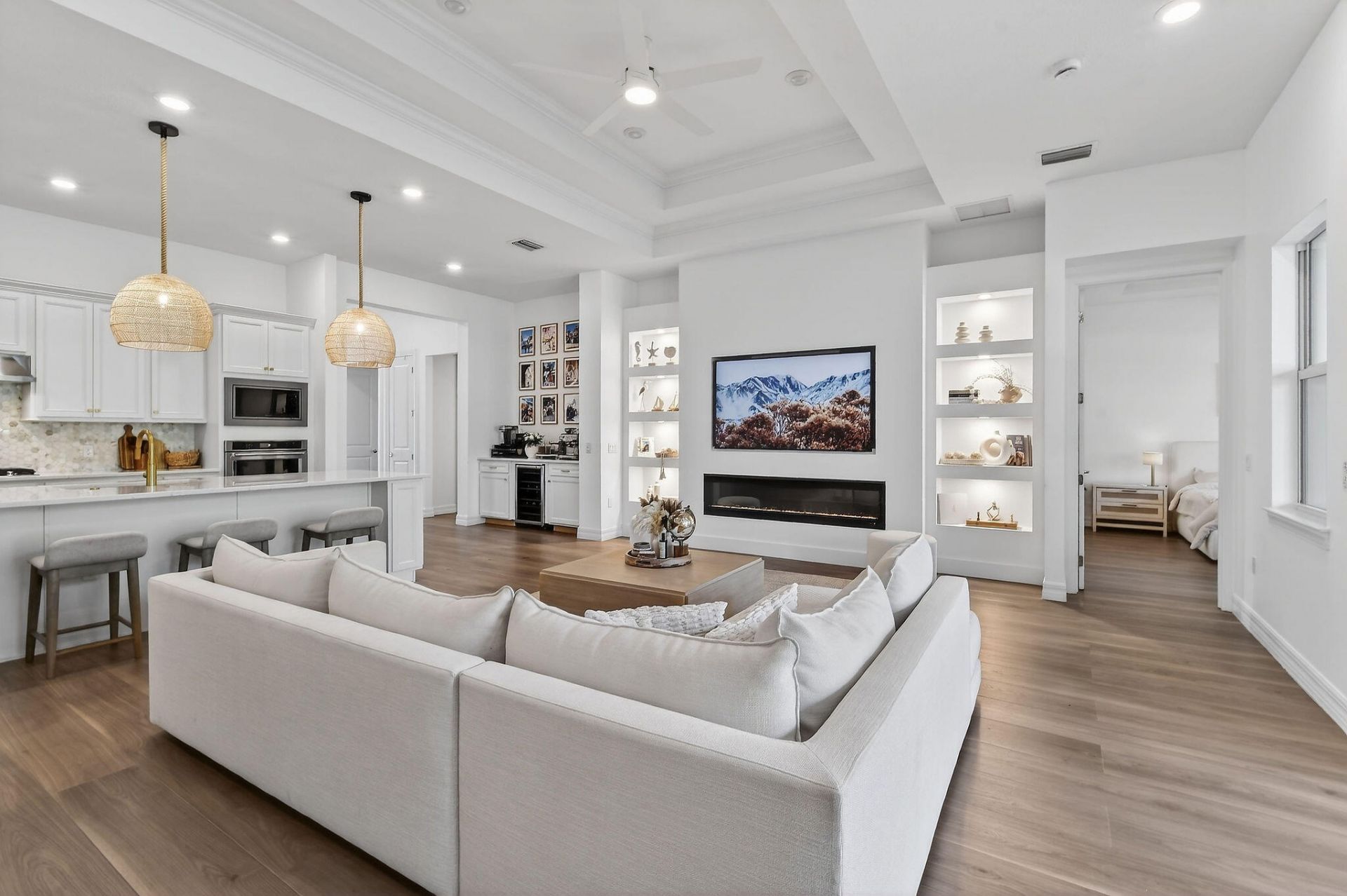 Beautiful 2024 construction, 3 bed/2.5 bath + den, home featuring a 2-car garage and approximately $150,000 in upgrades. This thoughtfully designed layout places the kitchen at the center of the home, overlooking the caf? area, living room, and spacious backyard--ideal for everyday living and entertaining. The home offers a private owner's suite and guest suite, both with abundant natural light and spacious walk-in closets. The kitchen showcases an oversized island, stainless steel appliances, w...Beautiful 2024 construction, 3 bed/2.5 bath + den, home featuring a 2-car garage and approximately $150,000 in upgrades. This thoughtfully designed layout places the kitchen at the center of the home, overlooking the caf? area, living room, and spacious backyard--ideal for everyday living and entertaining. The home offers a private owner's suite and guest suite, both with abundant natural light and spacious walk-in closets. The kitchen showcases an oversized island, stainless steel appliances, walk-in pantry, upgraded 42'' cabinetry, quartz countertops, and soaring 10'8'' ceilings. Additional highlights include a large laundry room, ample storage, Smart Home technology, and a beautifully appointed owner's bath with an upgraded tile shower and glass enclosure. Full Upgrades List Includes: -Wide-plank water-resistant wood flooring throughout-Custom wine and coffee bar with designer finishes-Master bathroom fully renovated by interior designer with floor-to-ceiling tile-Designer guest bathroom with floor-to-ceiling tile and custom oversized drapery-Pool-coded privacy fencing enclosing entire backyard-Custom 12-foot built-in for fireplace and entertainment center with integrated ambient lighting-Oversized 12-foot kitchen island with upgraded granite, matching wine/coffee station-Oversized kitchen and gold kitchen faucet and pull-down sprayer-Upgraded faucets in all bathrooms-Statement coastal pendant lighting above kitchen island-Statement chandeliers in the master suite, main living area, and one additional bedroom-Oversized designer ceiling fans on terrace and main living area-Tesla charger professionally installed-Custom pull-down attic staircases for easy access and added storage-Smart front door with Ring camera and fingerprint-access lock-Gas line pre-installed and ready for future outdoor kitchen installation
